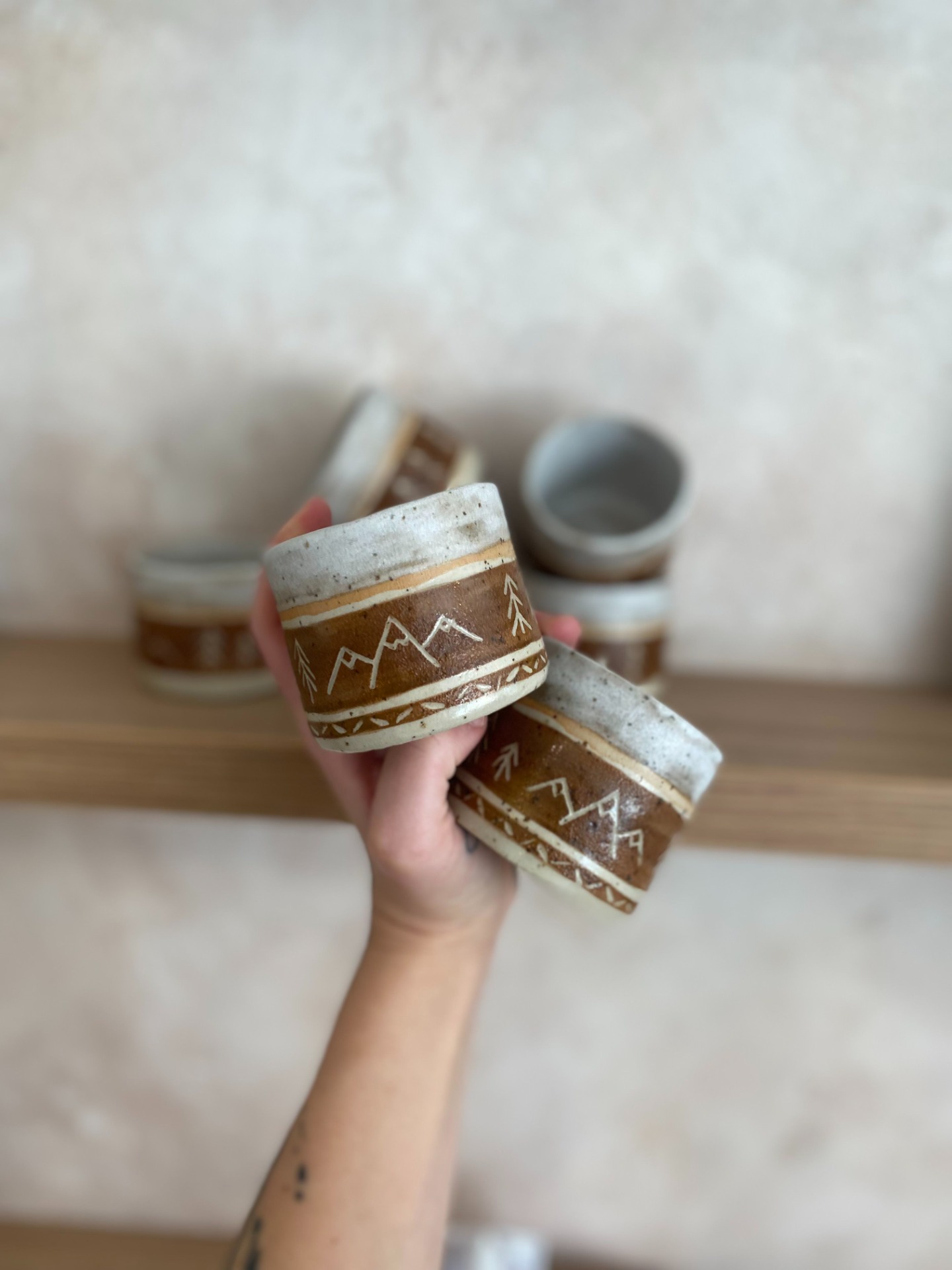 A tak vznikly kalíšky. Jsou ručně mačkaný, nepravidelný, strukturovaný, zemitý. Jsou moje vysněný. Jsou já.